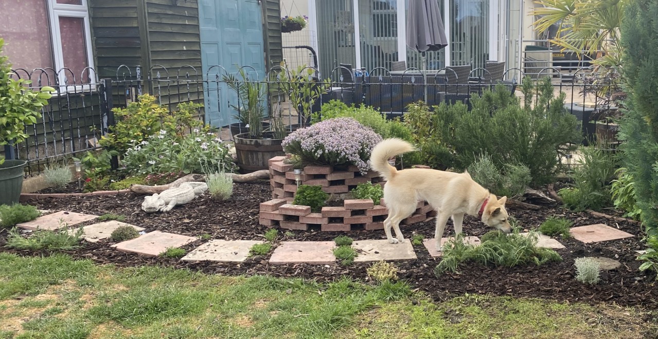 This photo shows my dog Millie doing some botanical self-selection in the herb garden I created