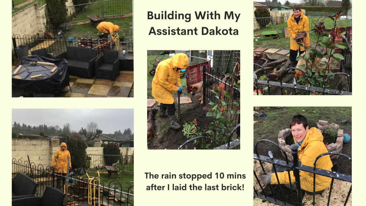 Having done all the research and decided what I was going to do I couldn't wait to get out there and start, however strong wind and torrential rain were forecast for the next 6 days. I sat and listened to the rain lashing against the window all morning, then decided to put a mac on and just get out there and brave it. Of course, I always had my constant assistant Dakota to help me by adding to the digging, wanting to play and running off with my tools!