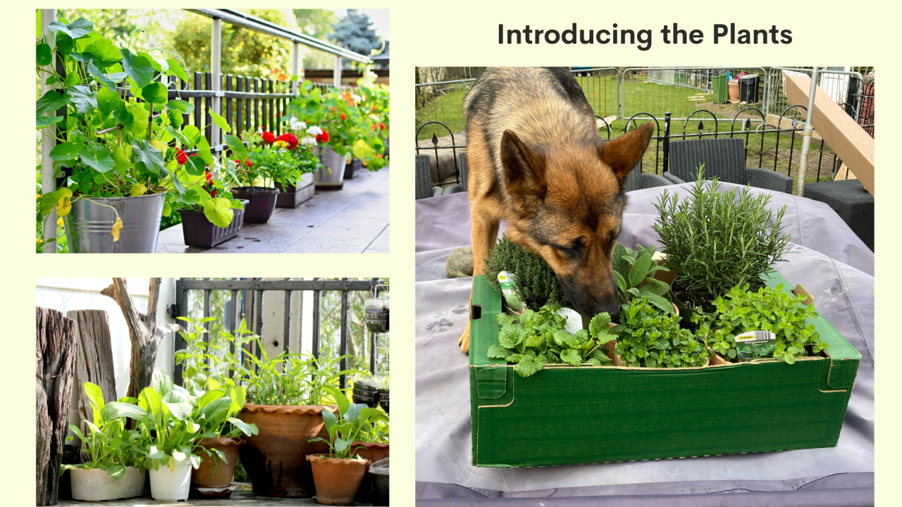 Containers can be good for senior dogs to save them having to bend down to reach them. I wanted some plants that I could put down straight away, so did buy some established plants, though I also purchased some seeds to plant of Chamomile, Valerian, Catmint, Yarrow, Lemon balm, Coriander and Basil. If you decide to plant directly in the ground, it is still worth keeping Mint in a container as it spreads rapidly! It is important when creating anything for your dogs that you have no expectations. They may enjoy it or even ignore it. I knew Dakota was going to enjoy these plants as she leapt onto the table where they were, to investigate them before I even got them into their pots.