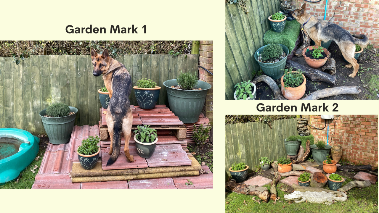 If you decide to embark on your own sensory garden project, the first thing you need to do is decide where it is going to be. Initially I chose at the end of my garden, so it could be a special place that was away from the through fare traffic and somewhere quiet to retreat to. Your choice may be limited if you have a small garden or yard, but this set up shows how little space is needed and could be adapted for small areas. Anything you create needs to be safe for your dog, with safe plants and structures, so nothing wobbly that could frighten your dog. It also needs to be pleasing to your eye as you are going to see it every day. Many dogs enjoy climbing, so I knew I wanted some different levels. Pallets can be purchased cheaply and make a strong, stable base.